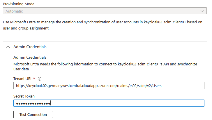 • Im Menü Provisioning die Verbindung zum Keycloak-SCIM-Server einrichten.