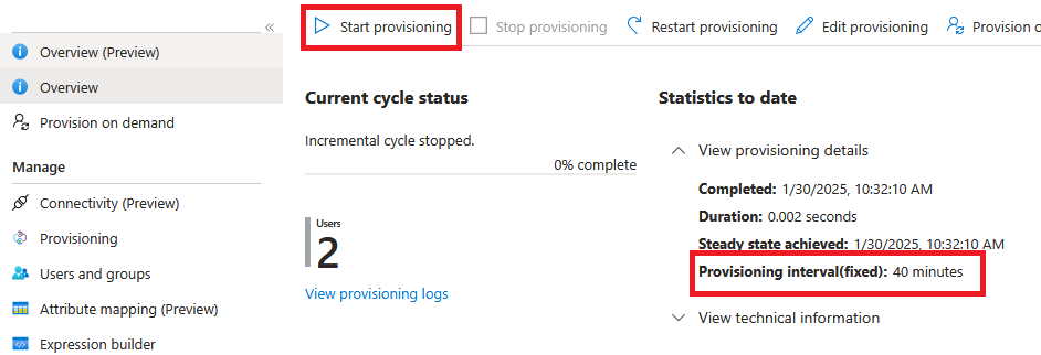 Entra ID synchronisiert Nutzer standardmäßig alle 40 Minuten. Dieses Intervall kann aktuell nicht geändert werden, jedoch besteht die Möglichkeit, die Synchronisation manuell über Start Provisioning oder für einzelne Nutzer/Gruppen on-demand durchzuführen.