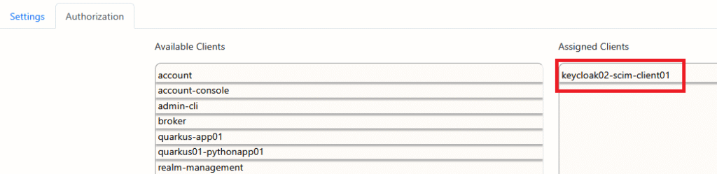 Im Tab Authorization ist ein Keycloak-Client zu hinterlegen, der die Rechte hat die Nutzer in Keycloak entsprechend zu aktualisieren. Zu der Konfiguration des Clients wird in einem Folgekapitel noch eingegangen.