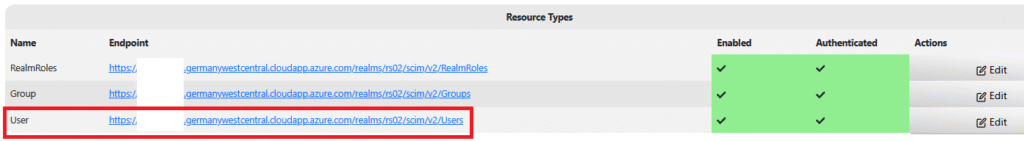 Im Tab Resoure Types finden sich die Endpunkte des SCIM-Servers. Hier ist besonders der Endpunkt User relevant, da dieser in EntraID hinterlegt werden muss: