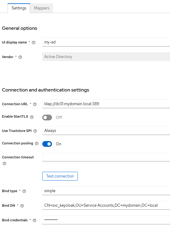 New-ADUser -Name "svc_keycloak" -SamAccountName "svc_keycloak" -AccountPassword (Read-Host -AsSecureString "Passwort eingeben") -Enabled $true -PasswordNeverExpires $true -UserPrincipalName "svc_keycloak@myomain.local"