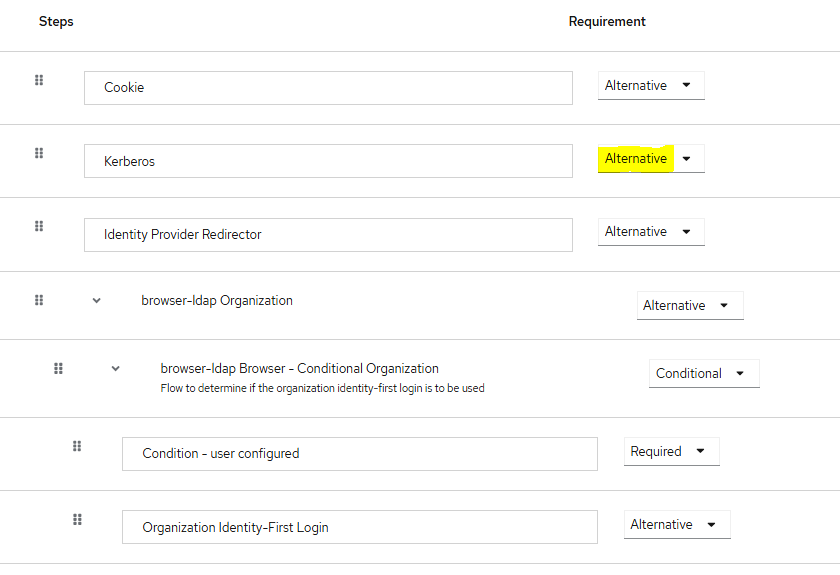 - Bearbeite diesen Flow und setze den Step „Kerberos“ auf „Alternative“